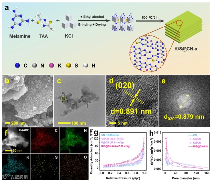 首先,将硫源(硫代乙酰胺)、钾源(氯化钾)和三聚氰胺在无水乙醇中混合均匀,将其烘干后高温煅烧得到一系列兼具钾/硫双活性位点的高结晶氮化碳催化剂(K/S@CN-x)。通过SEM、TEM、HR-TEM、EDS和BET等表征手段证实兼具K/S双位点的K/S@CN-x具有高结晶度和高比表面积。