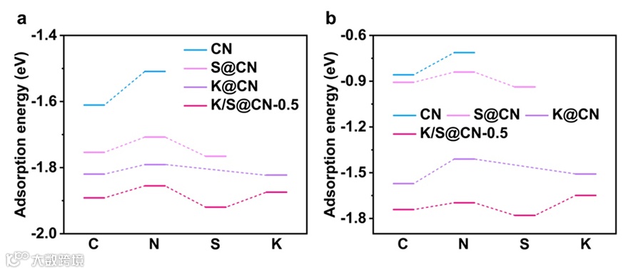图3. CN(a)、S@CN(b)、K@CN(c)和K/S@CN-0.5(d)的完全松弛结构的顶视图和侧视图。S@CN、K@CN和K/S@CN-0.5的形成能量(e)。棕色、灰色、黄色和紫色分别代表C、N、S和K。