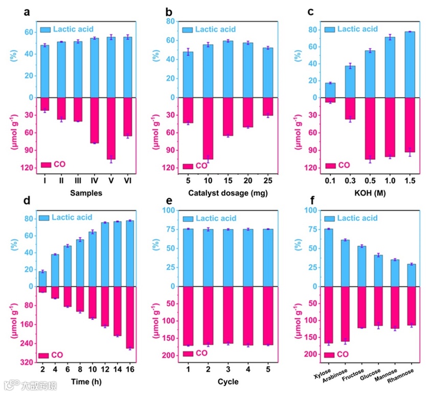 图6. 光催化生物质精炼耦合CO2还原的催化活性及条件控制。