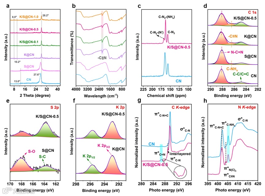 XRD研究发现,K@CN和K/S@CN-x中(002)晶面的衍射峰从CN的27.6o偏移至28.2o,表明K离子引入后氮化碳纳米片的层间距增加。FT-IR光谱、固态13C MAS NMR光谱和XPS谱图证实K/S@CN-0.5中存在氰基。XPS辅以XANES分析结果表明,K/S@CN-0.5中S位点以S-C键的形式存在。另外,DFT理论计算结果进一步证实,在S位点的引入过程中S元素倾向于取代N位点并形成S−C键,而K位点则出现在由庚嗪结构单元组成的melon链的间隙部位。