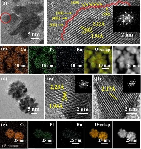 高分辨率透射电子显微镜(HRTEM)显示了PtCuRu 纳米花中单晶特征和清晰晶格条纹。可以清楚地观察到,花瓣边缘具有台阶和扭结的高指数晶面,如{310}、{311}和{411}。这些具有高密度低配位原子的高指数晶面可以促进CO的氧化,加快醇氧化反应速率,从而有助于催化活性的提高。EDS元素映射图和电子能量损失谱(EELS)线扫描剖面结果表明,Pt和Cu呈均匀分散,而Ru则主要分布在纳米花的两端及边缘,形成独特的富Ru边缘结构,提供了丰富的Ru活性位点。