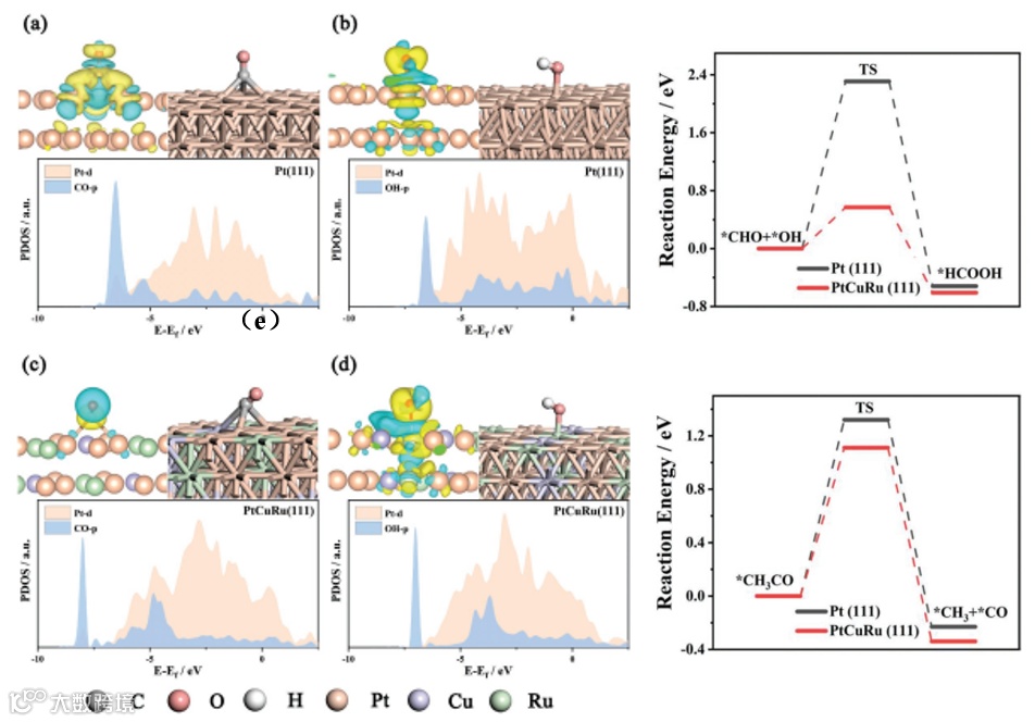 为揭示不同催化剂组分间的电子相互作用,文章采用DFT计算,进一步研究了PtCuRu 纳米花中多个活性中心对MOR和EOR的影响。结果表明,与纯Pt相比,合金表面对CO的吸附强度较弱,对OH的吸附更强,d-π轨道较小,证明了合金化可以减弱CO与金属表面之间的相互作用,并增强OH的吸附强度,从而提高催化剂的固有活性和抗中毒能力。此外,富Ru边缘的三维纳米花结构降低了MOR和EOR速率决定步骤的反应能垒,进一步加速反应动力学,增强电催化活性。