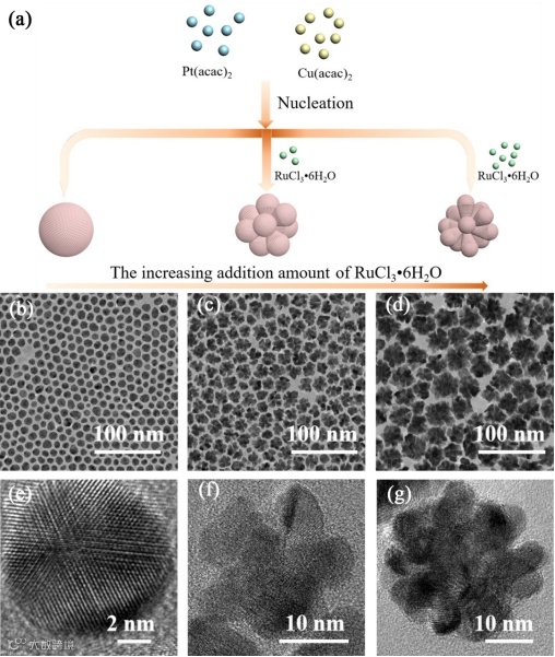 图1. PtCuRu三合金纳米花的制备及形貌尺寸调控。