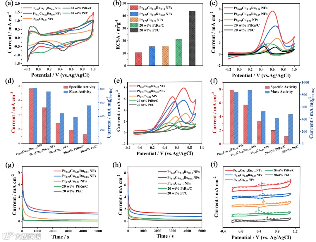 近年来,大量研究工作致力于开发铂基多金属纳米催化剂,以降低催化剂成本并提高稳定性。在各种合金元素中,Ru是改善MOR和EOR动力学的最佳选择,因为它易于吸附羟基自由基(OHads),这有助于CO中间体的氧化去除。此外,过渡金属的引入在降低成本的同时,还可以调节Pt的d带电子。综合上述原因,三元合金体系(PtCuRu)更有可能进一步提高电催化性能。本研究为设计和开发用于构建高性能DAFC的三维三元合金双功能催化剂提供了方向。