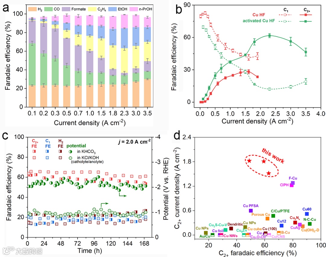 电化学测试结果表明,activated Cu HF在极宽的电流密度范围内均能保持优异的CO2还原性能。在低电流密度下的主要还原产物是CO和甲酸盐(C1产物),而在高电流密度下C2+产物占主导地位。在0.5 M KHCO3溶液中activated Cu HF最高可以获得62.8%的C2+法拉第效率,而Cu HF最高C2+的法拉第效率仅为28.1%。在0.5 M KHCO3和3.5 M KCl作为阴极电解液时activated Cu HF均表现出卓越的稳定性。1.4 A cm−2的C2+分电流密度优于之前报道的绝大部分铜基电催化剂。