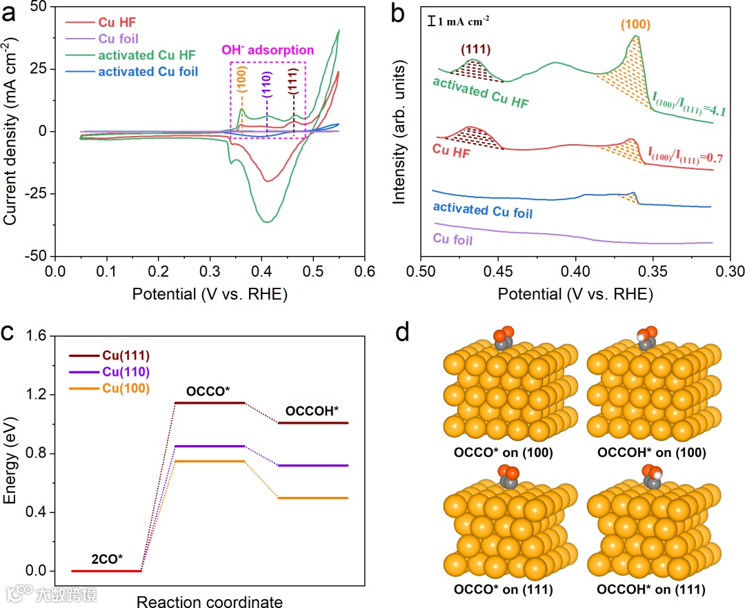 使用OH−在不同铜晶面上的电化学特征吸附行为来量化Cu(100)暴露,证实电化学重构的activated Cu HF暴露了更多的Cu(100)面,DFT进一步证实Cu(100)相较于Cu(111)和Cu(100)具有更低的CO二聚能垒,这有助于建立足够的CO覆盖并促进C-C耦合。