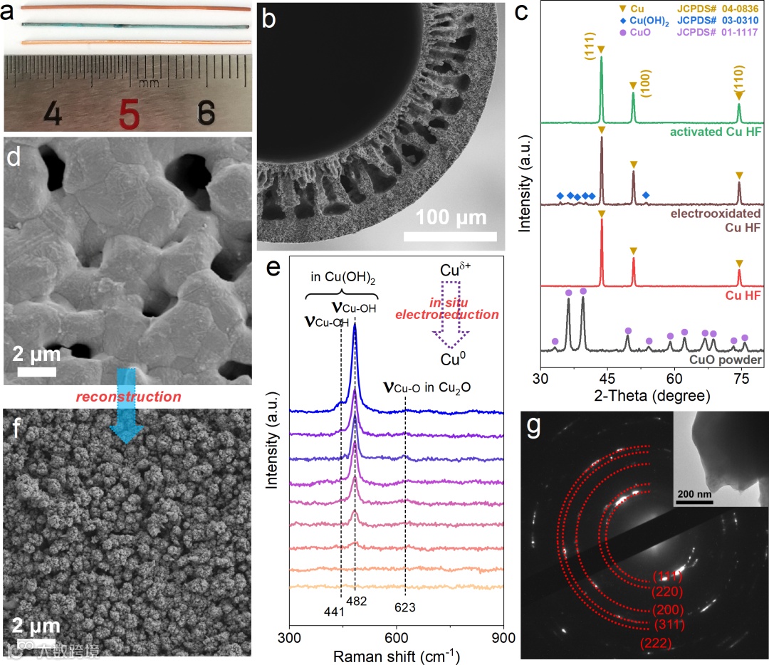 由商品氧化铜粉通过相转化/烧结法制得具有自支撑3D多孔结构的铜中空纤维(Cu HF)电极,进一步通过电化学活化重构电极表面得到活化的铜中空纤维(activated Cu HF)。原位拉曼证实活化过程中Cu(OH)2和Cu2O物种的还原,非原位拉曼,XRD和XPS均证实Cu0为最终的还原状态。