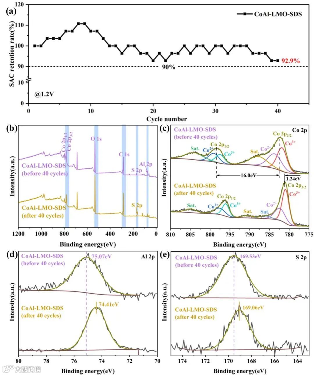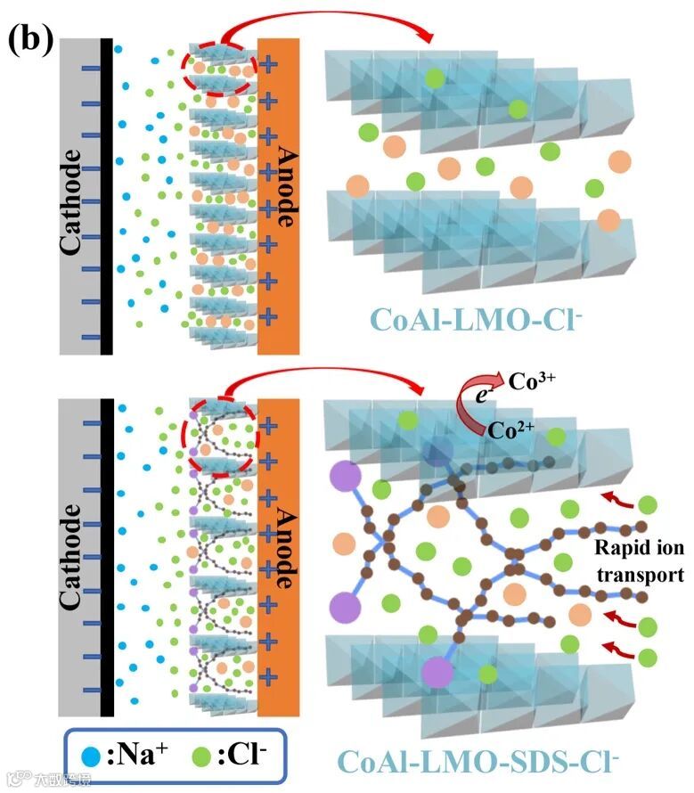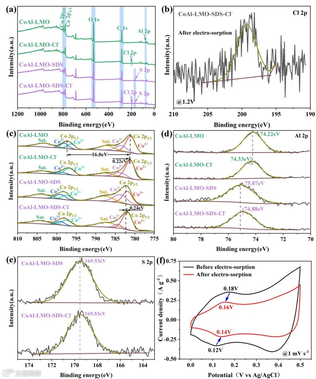 与热处理相比,电吸附后Co 2p谱峰向相反方向偏移且Co2+/Co3+比率降低,表明主体层被氧化。Cl-在静电引力作用下进入层间空间,形成Al-Cl和Co-Cl键,恢复了层状氢氧化物晶体结构。同时,S 2p谱峰与电吸附前一致,表明SDS与主体层键合稳定,展现了优异的循环稳定性。