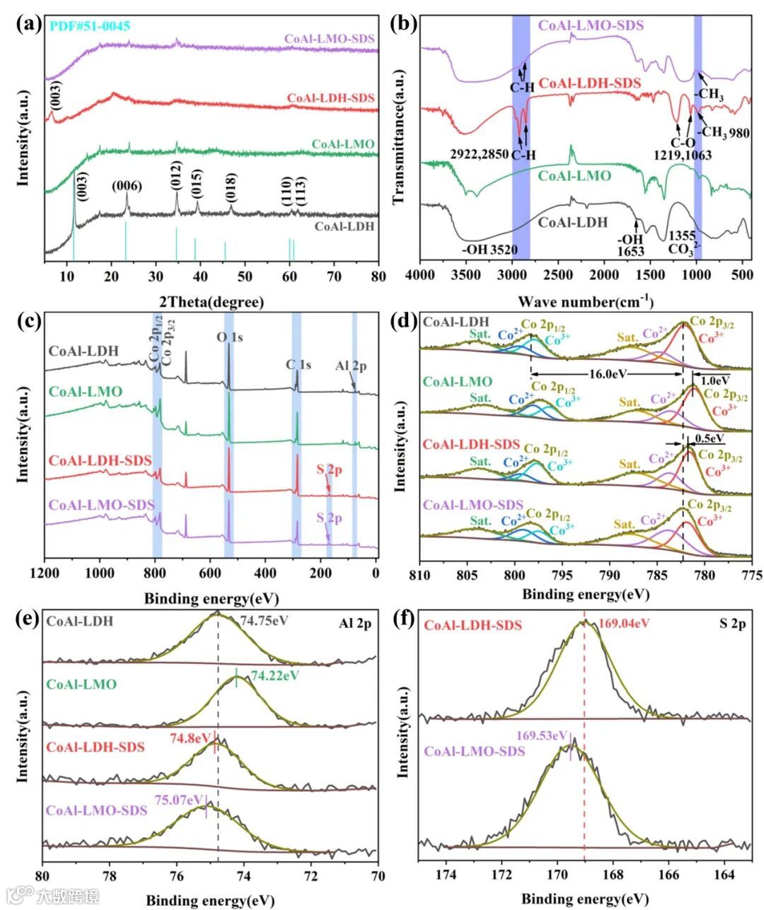 图2. CoAl-LDH-SDS/CoAl-LMO-SDS基材料的晶体结构及化学组成。