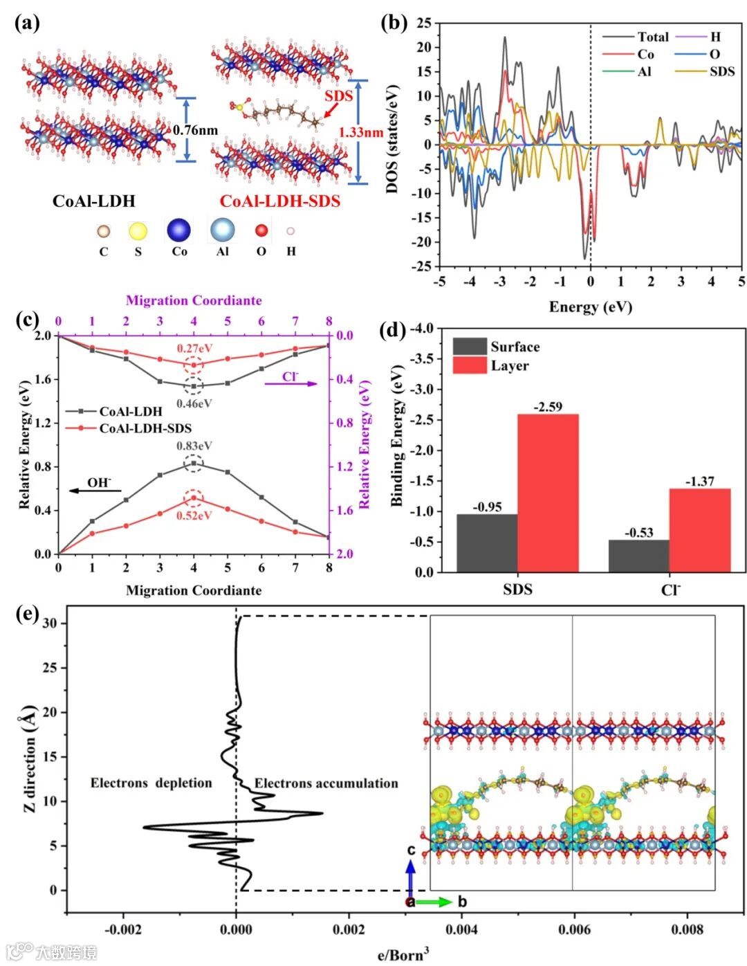 密度泛函理论计算分析了CoAl-LDH层间距调节在离子扩散过程和离子吸附能力中的作用。CoAl-LDH和CoAl-LDH-SDS中Cl-的扩散势垒分别为0.46eV和0.27 eV,表明增大的层间距促进了Cl-的扩散,与优异的电化学性能和快速去离子能力对应;此外,SDS对LDH的结合能始终大于Cl-,即CoAl-LDH对SDS的亲和力更强,有利于保持扩大的层间结构和优异的循环稳定性。