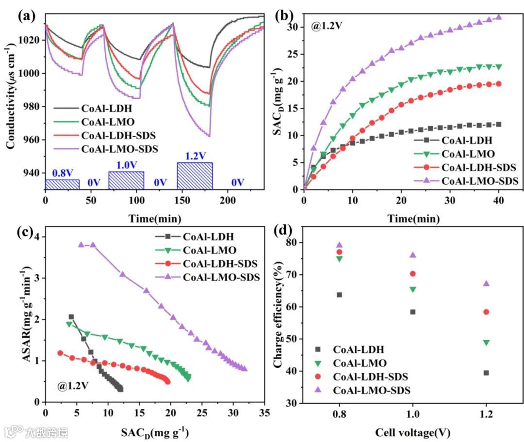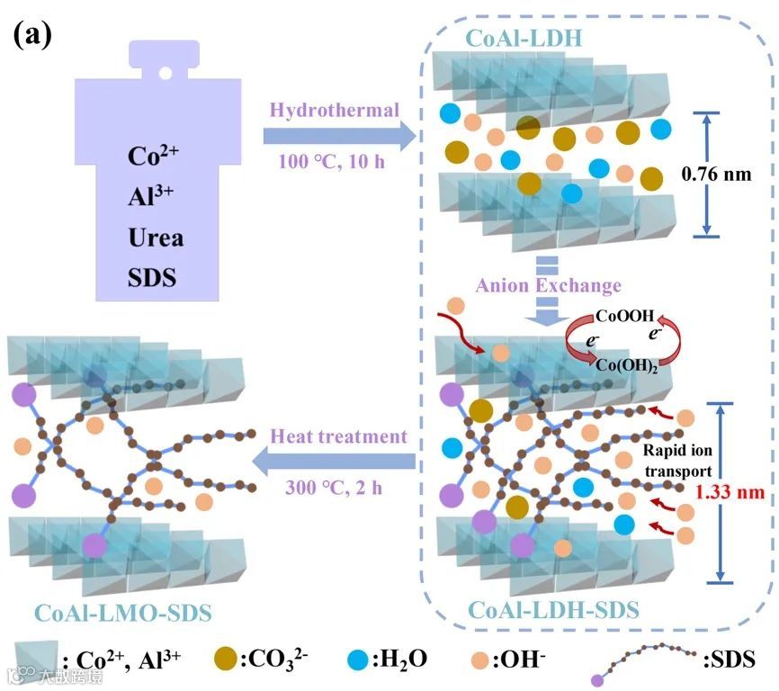 然而,LDHs/LMO狭窄层间距制约了离子的快速扩散,使得脱盐能力受到极大影响。本文选择十二烷基硫酸钠(SDS)作为插层剂,采用一步水热法将其引入CoAl-LDH层间,并通过适宜的热处理工艺获得CoAl-LMO-SDS,在电化学去离子中表现出优异的综合性能。