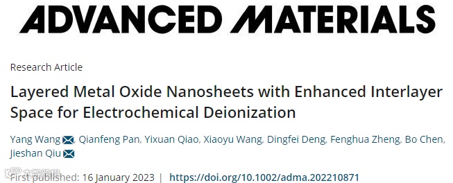 基于此,天津大学汪洋副教授与北京化工大学邱介山教授合作,在国际顶级学术期刊《Advanced Materials》上发表题为“Layered Metal Oxide Nanosheets with Enhanced Interlayer Space for Electrochemical Deionization”的研究文章。
