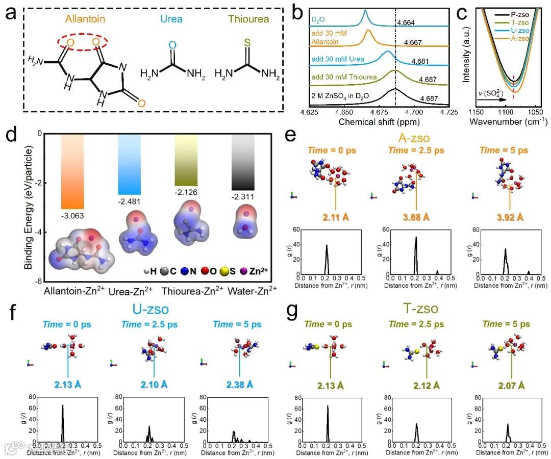 初步通过核磁共振谱(图1b)与红外光谱(图1c)证明,其中尿囊素的脱溶剂化效果最佳。进一步的分子动力学理论计算结果表明,g(r)峰(图1e)相对于尿素- ZnSO4(图1f)和硫脲- ZnSO4(图1g)的偏移量较大,表明尿囊素对水合Zn2+的破坏作用最强,极大地促进了Zn2+的脱溶剂化。