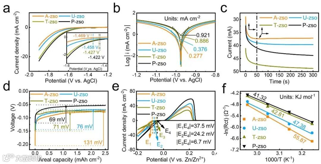 图2. (a) 在1M Na2SO4基线电解液和由1M Na2SO4和不同添加剂(30mM)组成的混合电解液中的LSV曲线(插图为局部放大图);(b) 不同电解液中Zn片的LSV曲线;(c) 不同电解液的Zn||Zn对称电池的CA曲线;(d) 不同电解质下Zn||Zn电池在5 mA cm-2时的初始成核过电位;(e) 不同电解质下铜箔上锌成核的CV曲线;(f) 根据Arrhenius公式计算的不同电解质下Zn||Zn电池的活化能。