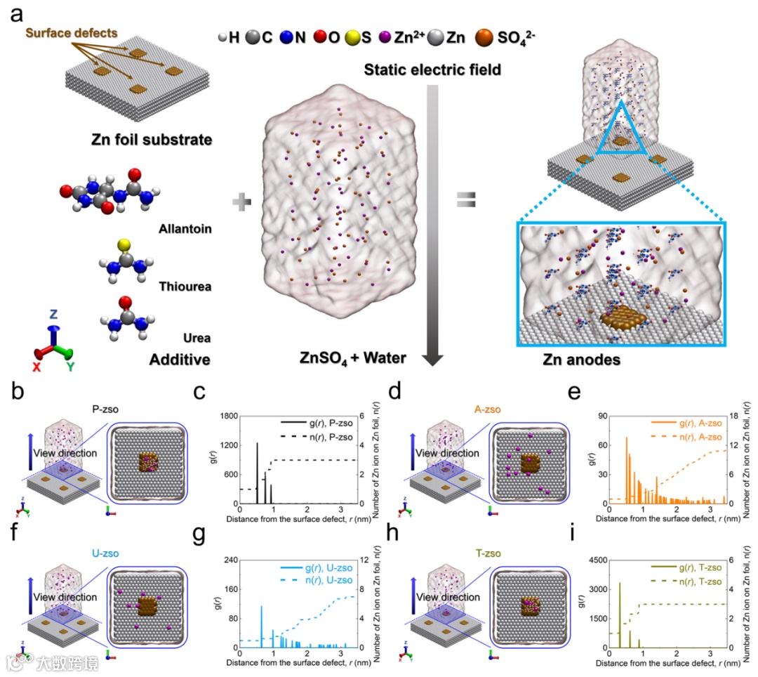 图5. (a) ZnSO4基线电解液中含有不同添加剂分子的Zn箔的分子动力学模拟模型;在ZnSO4基线电解液中(b)无添加剂,(d)含有尿囊素添加剂,(f)含有尿素添加剂,(h)含有硫脲添加剂的锌片表面沉积Zn的分子动力学模拟的3D快照,时间=10 ns;以及在ZnSO4基线电解质中(c)无添加剂,(e)含有尿囊素添加剂,(g)含有尿素添加剂,以及(i)含有硫脲添加剂RDFs, g(r),以及从分子动力学模拟收集到在锌片表面沉积的Zn2 +数量。