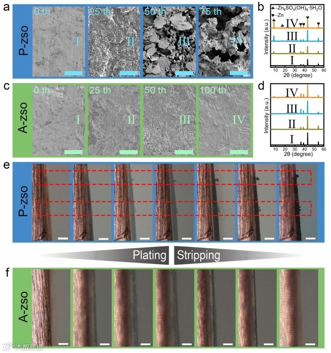 图4:(a, c)分别采用纯ZnSO4电解质和尿囊素-ZnSO4混合电解质的Zn||Zn对称电池在不同循环次数后(5 mA cm-2/2. 5 mAh cm-2)的原位SEM图像和(b, d)相应的XRD图谱,比例尺:20 μm;在(e)纯ZnSO4电解质和(f)尿囊素-ZnSO4混合电解质中分别原位监测Cu||Zn非对称电池中锌的电镀/剥离过程光学照片(比例尺:250 μm)。