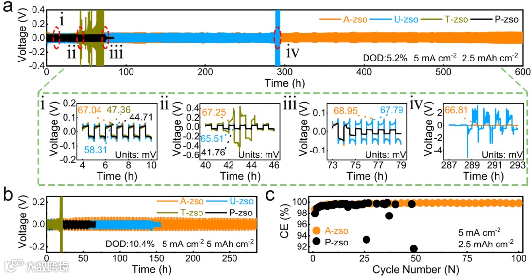 对称电池循环测试结果表明使用尿囊素-ZnSO4混合电解液的锌负极相较于纯ZnSO4的锌负极展现出更加优异的循环性能及库伦效率。在5 mA cm-2/2.5 mAh cm-2条件下的循环寿命达到了600 h (图3a)。
