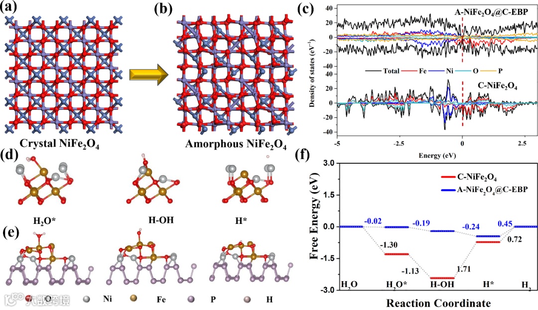 图4 (a-b)从晶体(C-NiFe2O4)到非晶(A-NiFe2O4@C-EBP)的晶体结构转换示意图;(c) C-NiFe2O4和A-NiFe2O4@C-EBP的PDOS;不同反应阶段C-NiFe2O4 (d)和A-NiFe2O4@C-EBP (e)表面的局部结构构型(f)碱性环境下C-NiFe2O4和A-NiFe2O4@C-EBP电催化剂的HER能量图。