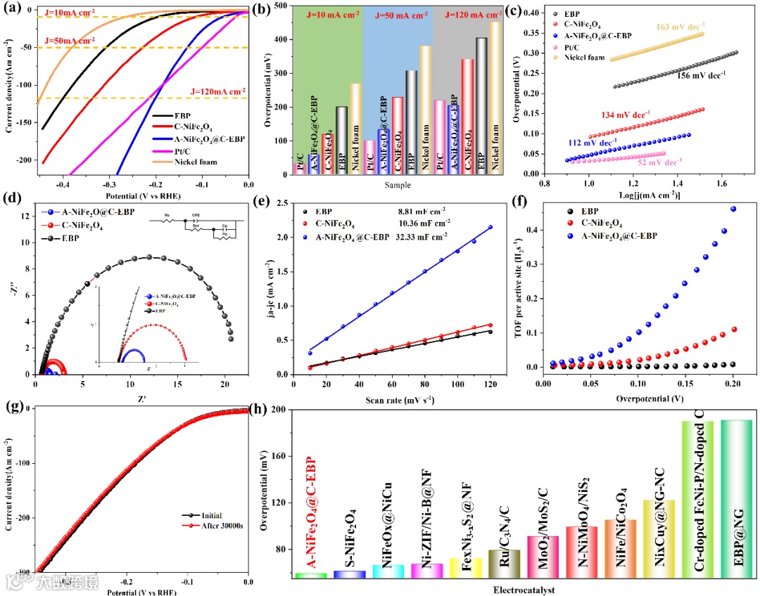 图3 EBP、C-NiFe2O4和A-NiFe2O4@C-EBP的电化学测定;(a)极化曲线;(b)电流密度为10 mA cm−2的HER过电位;(c) Tafel图;(d)环境影响评价图;(e)双层电容;(f) EBP、C-NiFe2O4和A-NiFe2O4@C-EBP在10 mV ~ 200 mV不同过电位下的TOFs;(g) A-NiFe2O4@C-EBP在800 CV循环试验前后的HER极化曲线;(h)不同电极在10ma /cm-2电流密度下过电位的比较。