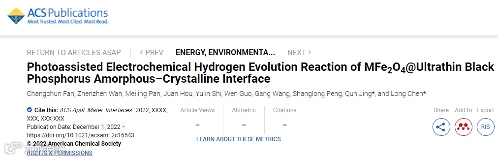 相关文章以“Photoassisted Electrochemical Hydrogen Evolution Reaction of MFe2O4@Ultrathin Black Phosphorus Amorphous−Crystalline Interface”为题发表在ACS Appl. Mater. Interfaces上。第一作者为硕士研究生范长春,通讯作者为石河子大学陈龙副教授和新疆大学井群副教授,第一通讯单位为石河子大学。