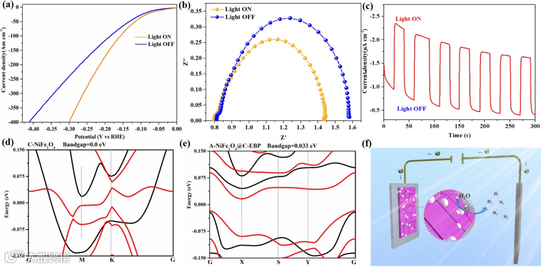 图5 A-NiFe2O4@C-EBP的光电催化性能。(a)催化剂在有光和无光照条件下的极化曲线和(b) EIS Nyquist图;(c)瞬态光电流响应;(d) C-NiFe2O4的能带结构(e) A-NiFe2O4@C-EBP;(f) PE-HER用A-NiFe2O4@C-EBP光阳极示意图。