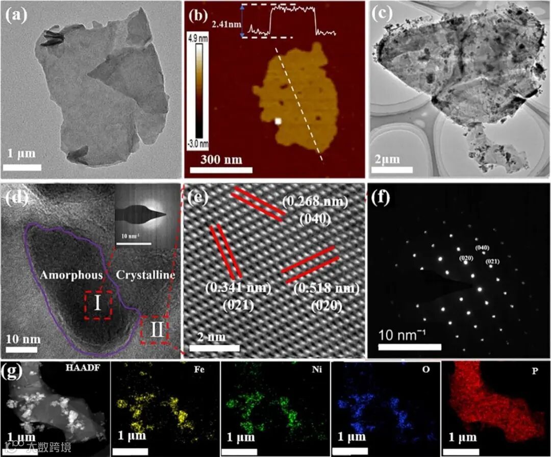 图1 (a) EBP TEM图像;(b) EBP纳米片的AFM图像和相对厚度分析;(c) A-NiFe2O4@C-EBP的TEM图像(d) A-NiFe2O4@C-EBP的HRTEM图像(插图:镍铁氧化物的SAED图);(e) A-NiFe2O4@C-EBP表面EBP区域的点阵参数;(f) A-NiFe2O4@C-EBP中EBP区域对应的SAED模式;(g) A-NiFe2O4@C-EBP的Fe, Ni, O, P的分布图。
