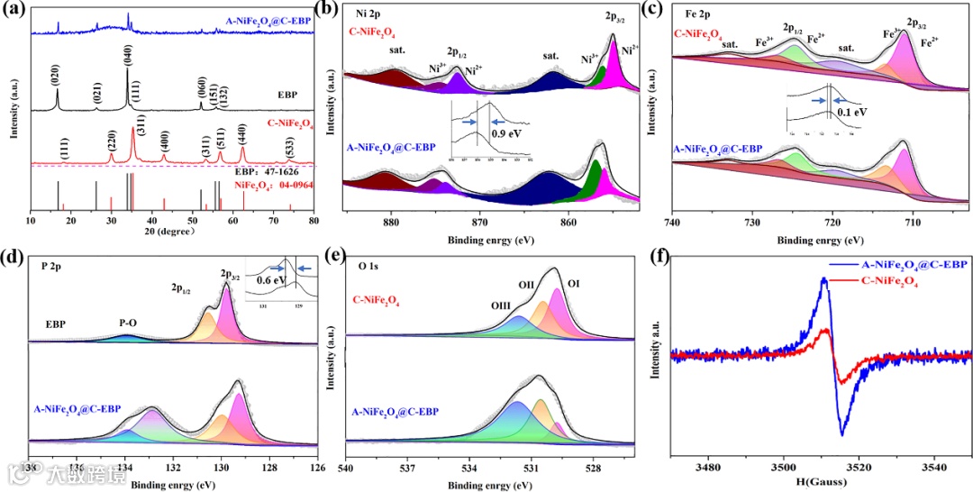图2 (a) C-NiFe2O4、EBP和A-NiFe2O4@C-EBP的XRD谱图;制备样品的(b) Ni 2p、(c) Fe 2p、(d) P 2p和O1s (e)的高分辨率XPS光谱;(f) C-NiFe2O4和A-NiFe2O4@C-EBP的ESR光谱。