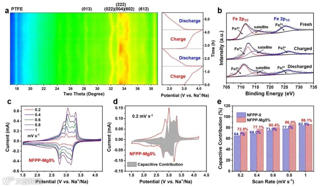 原位XRD和非原位XPS表明,镁掺杂NFPP/C复合材料储钠机制为以Fe为氧化反应中心的单相嵌入型反应。同时,基于多扫速CV测试的分容计算表明,具有较高的电容容量贡献占比。结合两者结果,镁掺杂NFPP/C复合材料的储钠容量主要由嵌入型赝电容机制贡献,这也是其展现出优异倍率性能和超长循环寿命的原因。