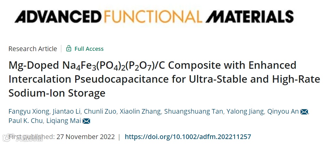 基于此,来自武汉理工大学的麦立强教授和安琴友教授等人在国际知名期刊Advanced Functional Materials上发表题为“Mg-doped Na4Fe3(PO4)2(P2O7)/C composite with enhanced intercalation pseudocapacitance for ultra-stable and high-rate sodium-ion storage”的研究论文。