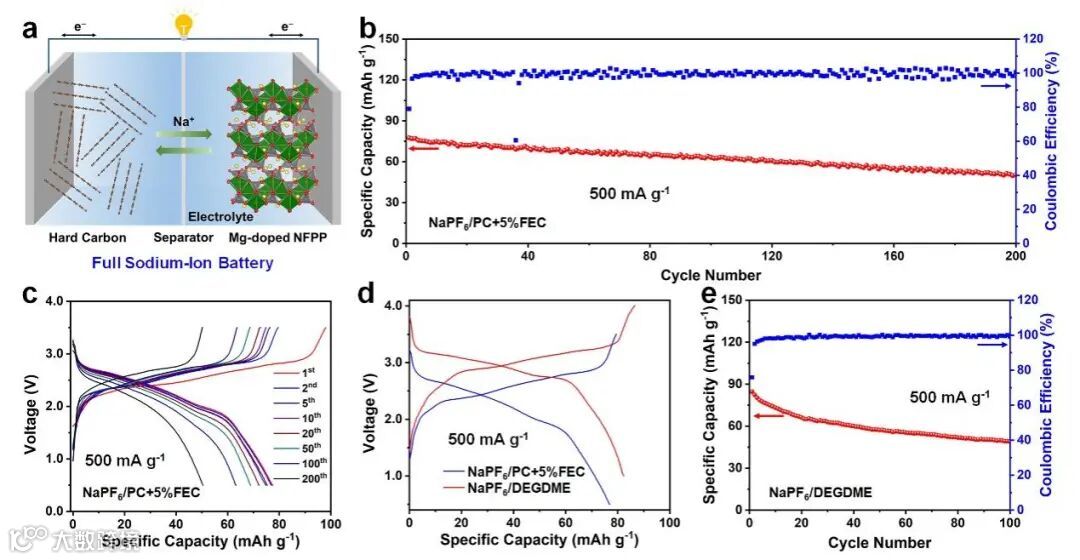 图4. 基于镁掺杂NFPP/C复合材料的钠离子全电池的电化学性能