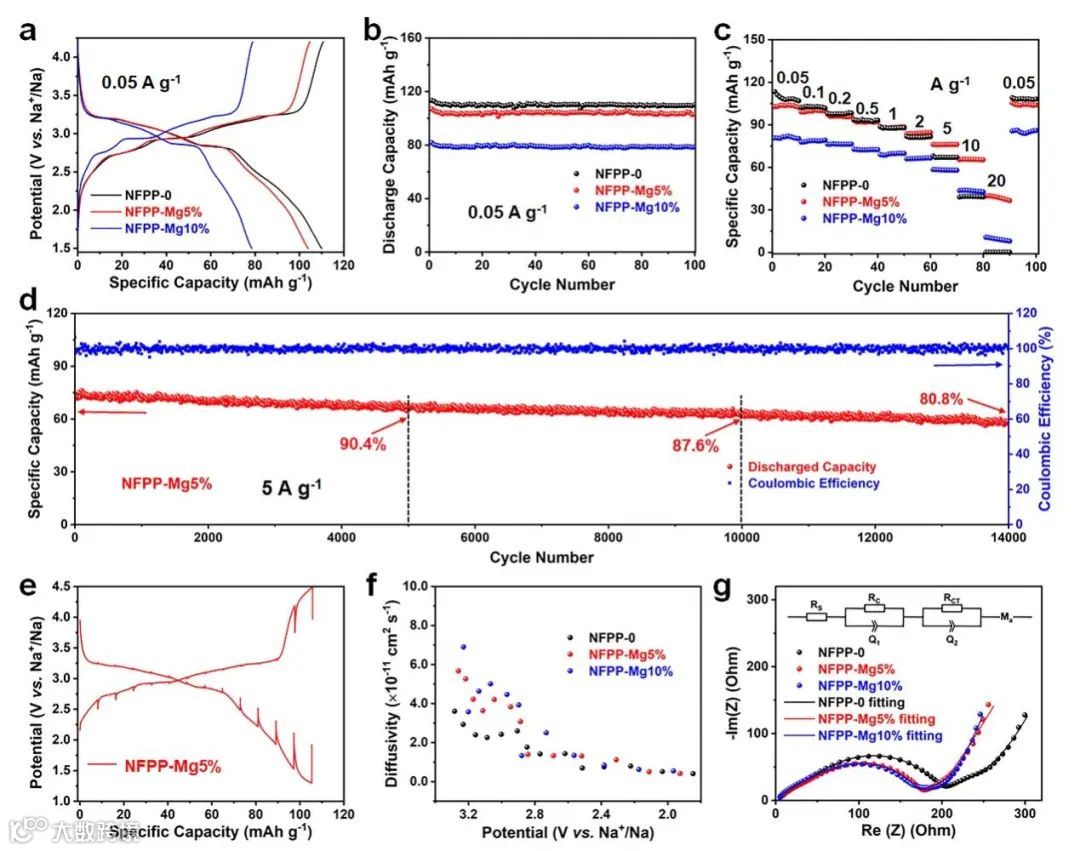 所获得的5%镁掺杂NFPP/C复合材料(NFPP-Mg5%)作为钠离子电池正极材料时,展现出超长的循环寿命和显著提升的倍率性能。在5 A g−1电流密度下循环 14000 次后,NFPP-Mg5%容量保持率为80.8%,这是目前已报道的NFPP基钠离子电池正极材料的最长循环寿命。此外,在20 A g−1的大电流密度下,NFPP-Mg5%仍展现出约40 mAh g−1的容量。电化学动力学分析表明,镁掺杂后钠离子扩散系数增大,同时界面电荷转移阻抗减小,这是展现出优秀倍率性能的原因。
