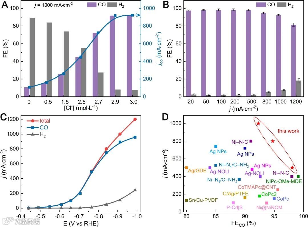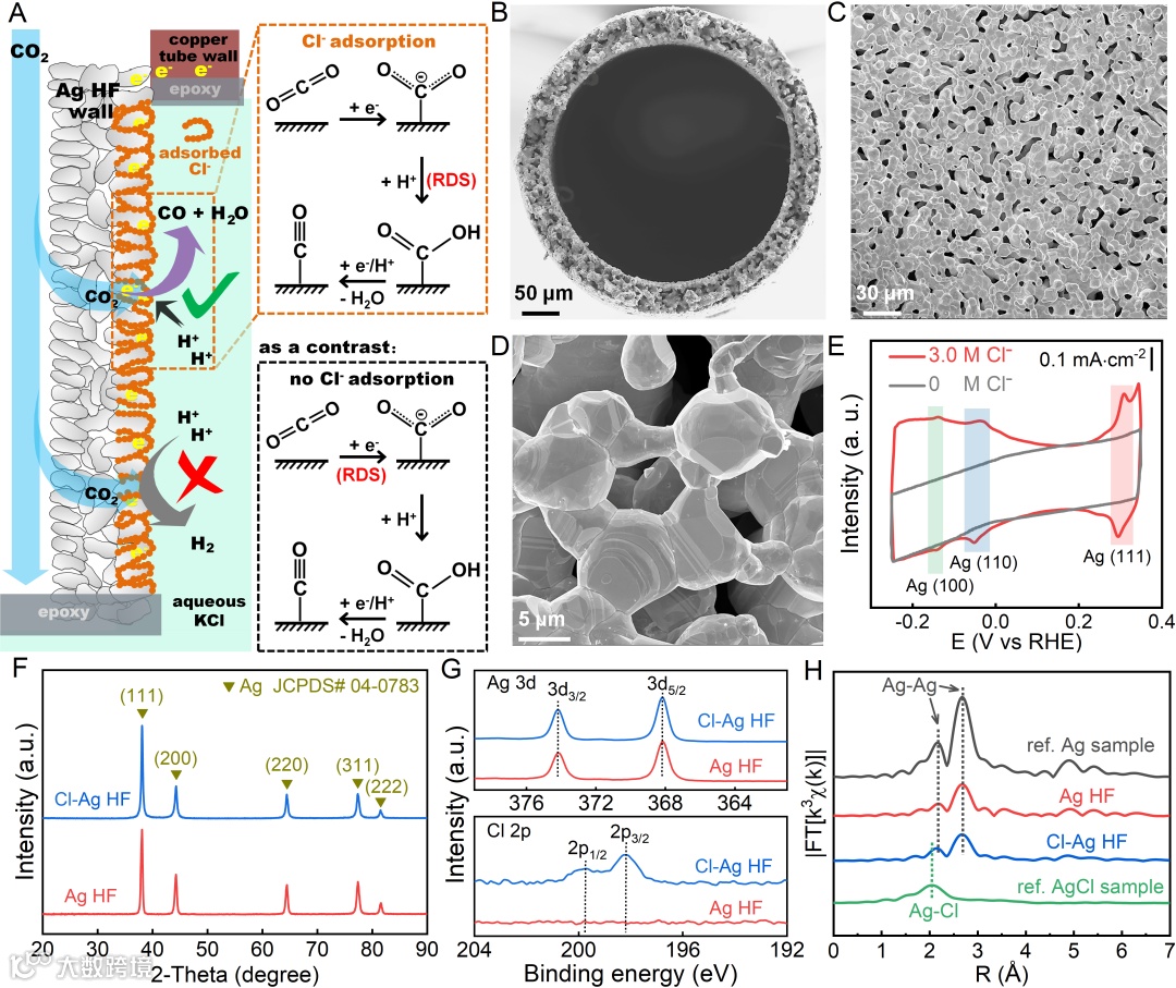 本文中,中科院上海高等研究院的陈为、魏伟及孙予罕研究团队在前期银中空纤维 (Ag HF)电极高效电还原CO2转化生成CO的基础上,进一步通过在电极质溶液中引入氯离子,利用低配位氯离子特征吸附功能调控Ag HF电极表面电子结构,优化电还原CO2制CO反应的动力学过程,同时极大抑制析氢副反应的发生,实现了安培级电流密度和高CO法拉第效率的稳定运行。