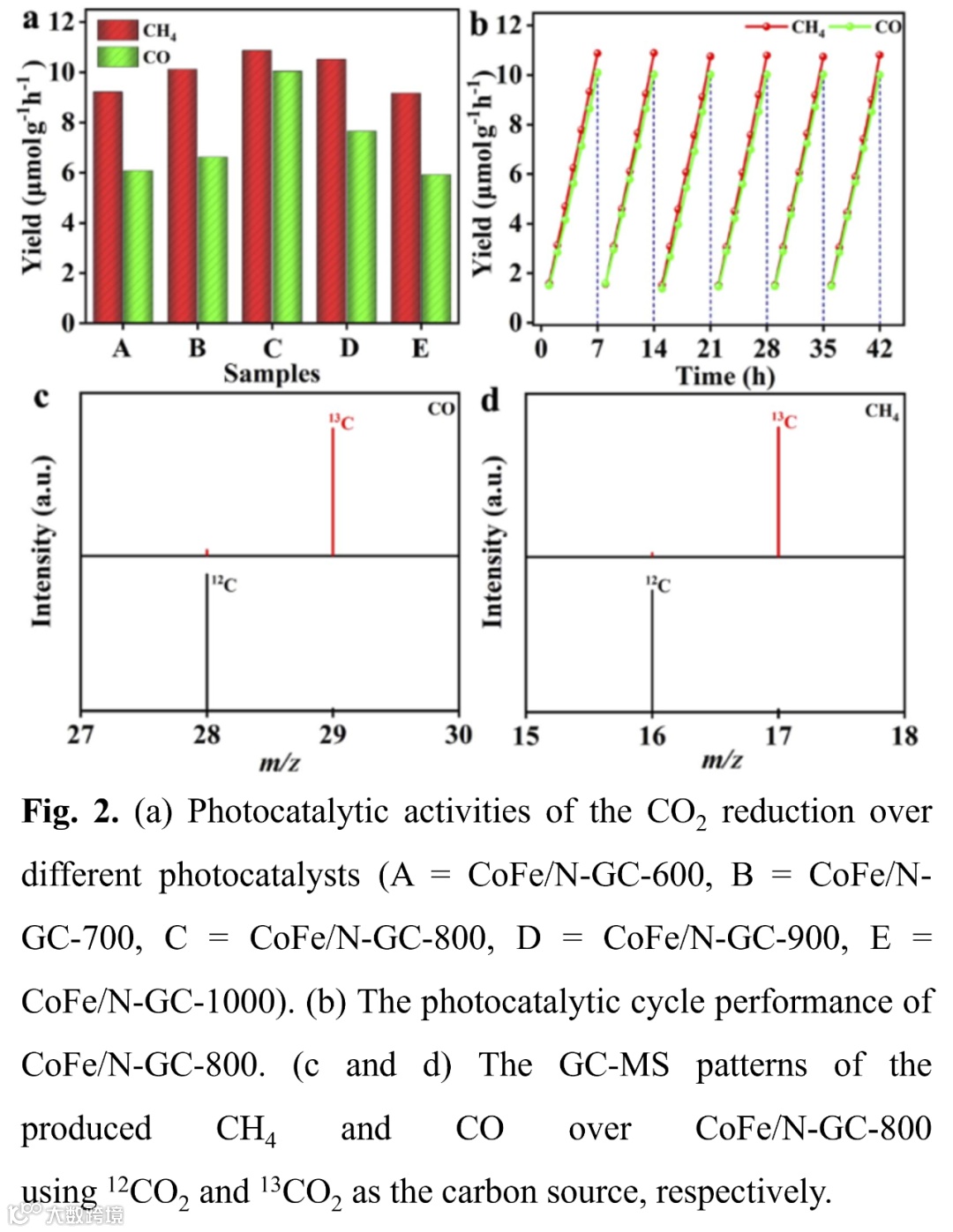 实验证明,在 300 W Xe光灯照射下CoFe/N-GC-800,催化剂光催化CO2还原产物主要为CH4 和 CO。其中,CH4产率为10.87 μmol/(h·g)-1,CO产率为10.04 μmol/(h·g)-1。在循环42 h后,CO和CH4的产率仍分别保持在第一次循环的 相似的稳定性,表明 CoFe/N-GC-800,催化剂具有良好的稳定性。目前,我们的催化体系在大多数氧化物光催化剂中的稳定性是相对较高的。利用13CO2 的光催化还原进行了 GC-MS 同位素标记实验,m/z = 17 和 29 的独特信号验证了光催化 CO2还原中产生的主要 CH4 和 CO 来自 13CO2碳源。同位素标记实验证实,在所制备的光催化剂上检测到的产物来自 CO2 源气体,而不是任何残留的碳物种。
