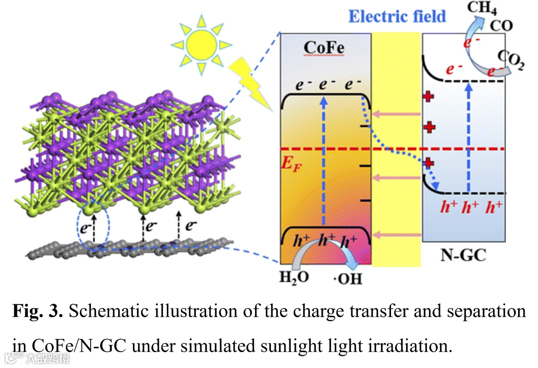 我们提出了CO2RR在合金复合材料上的光催化机理(如图3所示)。基于DFT和实验数据,绘制了CoFe合金NPs和N-GC光催化过程中的电荷转移机理。N-GC和CoFe合金NPs的功函数分别为3.50和3.77 eV,说明CoFe合金NPs的功函数比N-GC.更负因此,当CoFe合金NPs和N-GC结合在一起时,电子将从N-GC迁移到CoFe合金NPs,直到它们的费米能级达到平衡CoFe合金NPs的能带由于电子积累而向下弯曲,而N-GC的能带由于电子消耗而向上弯曲。在光照下,CoFe合金NPs和N-GC的价带(VB)电子被激发到导带(CB)。由于存在一个从N-GC指向CoFe合金NPs的内电场,CoFe合金NPs CB中的电子将转移并与N-GC VB中的空穴重新结合,而不是N-GC CB中的电子。68 N-GC CB中的光生电子以水为质子源将CO2还原成CH4和CO。CoFe合金NPs的VB孔发生氧化反应,完成催化循环。这种载流子转移机制不仅促进了载流子的分离,而且保持了良好的氧化还原能力,为CoFe/N-GC催化剂上的光催化CO2RR提供了强大的驱动力。