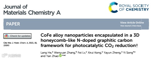 He, Lang., Zhao Yan et al., CoFe alloy nanoparticles encapsulated in a 3D honeycomb-like N-doped graphitic carbon framework for photocatalytic CO2 reduction. Journal of Materials Chemistry A, 2022. 10(41): p. 22093-22104.