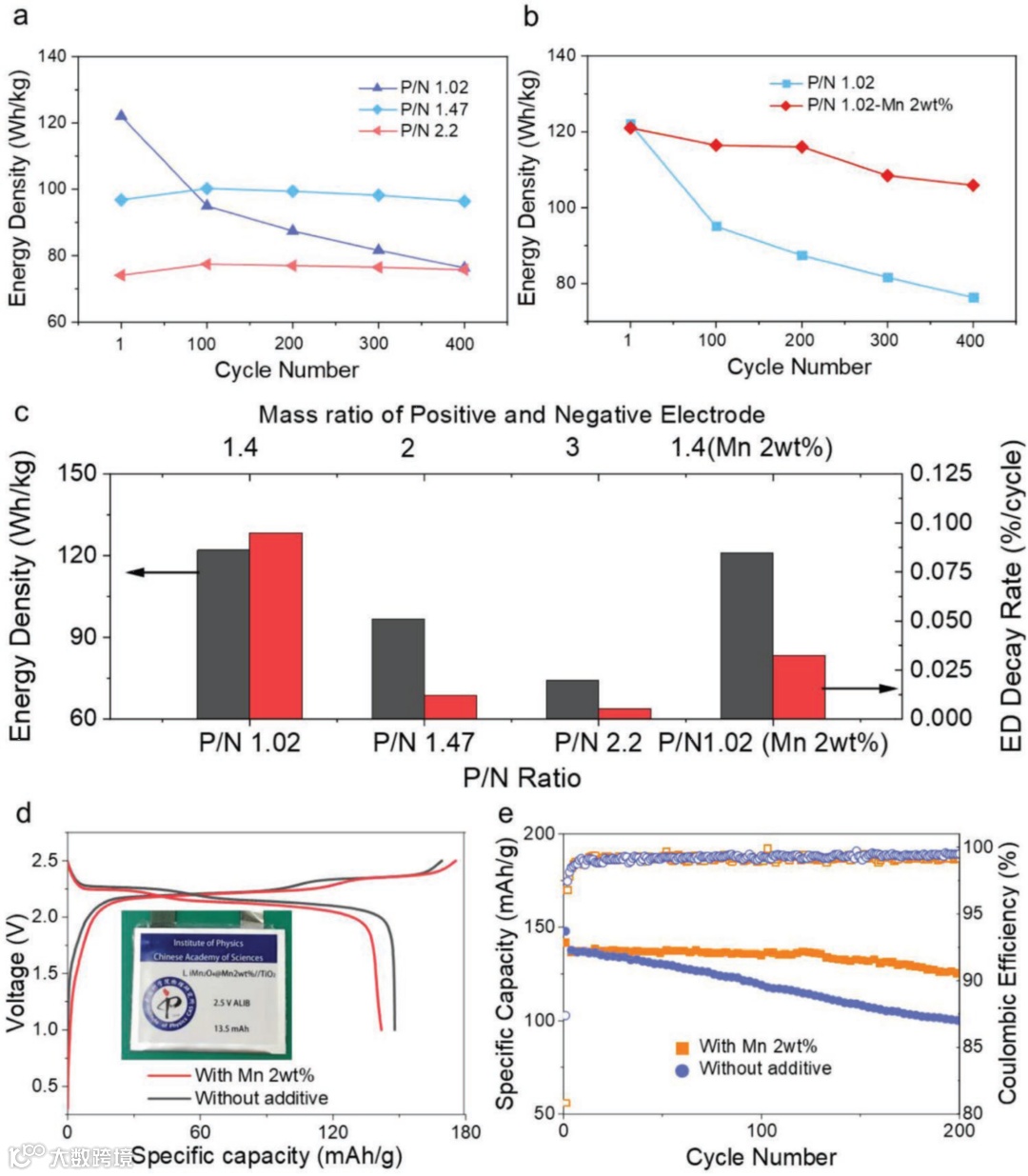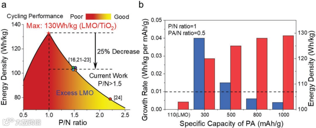 图1. P/N比和氧化补偿添加剂对高压水系锂离子电池(锰酸锂||二氧化钛)能量密度和循环寿命的影响。(a)不同的 P/N 比对能量密度和循环性能的影响。(b)在 P/N 比为 1 和 PA/N 比为 0.5 时,加入不同比容量的氧化补偿添加剂时的能量密度估算值。