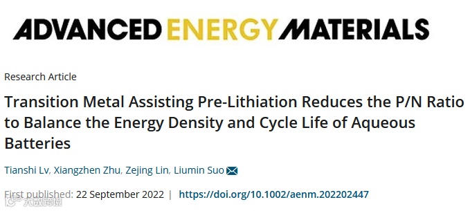 Tianshi Lv, Xiangzhen Zhu, Zejing Lin, Liumin Suo*. Transition Metal Assisting Pre-Lithiation Reduces the P/N Ratio to Balance the Energy Density and Cycle Life of Aqueous Batteries. Adv.Energy.Mater. 2022.