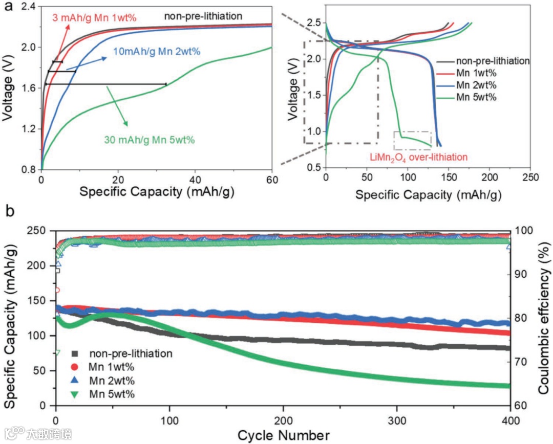 图 3. 锰金属氧化补偿添加剂在锰酸锂||二氧化钛全电池中的补偿性能验证。(a)在锰酸锂||二氧化钛全电池中添加不同比例锰金属的初始电压曲线和初始充电曲线放大图。(b) 锰酸锂||二氧化钛全电池中添加不同比例锰金属的循环稳定性和库伦效率。