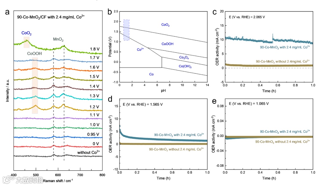 作者通过向电解液中滴加微量Co2+的方式实现了载体MnO2在酸性环境下OER活性(6.9倍)和稳定性(46.4倍)的提升。原位拉曼光谱等表征发现在极化曲线测试过程中,Co2+存在明显的相变过程,并最终在高电位(大于1.8 V vs. RHE)下以CoO2的形式稳定存在于载体MnO2表面。相变产生的CoO2可以有效分担和抑制OER电位对载体MnO2的分解作用,从而极大地提升了整个催化体系的稳定性。