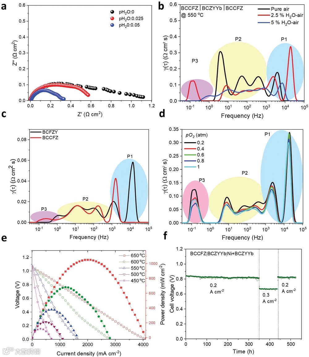 图2 (a)结构为BCCFZ|BCZYYb7111|BCCFZ的对称电池在550oC,气氛为0%,2.5%和5%H2O-空气时阻抗图;(b)对(a)中结果的DRT分析结果;(c)在650oC,气氛为2.5%H2O-空气时BCCFZ和BCFZY对称电池的DRT 结果;(d)在550oC,气氛为2.5%H2O时不同氧分压条件下的BCCFZ对称电池的DRT 结果;(e)以Ni-BCZYYb7111阳极和BCCFZ阴极制备的阳极支撑型单电池在H2气氛下650-450oC下的I-V-P曲线;(f)该单电池在550oC,不同电流密度下的长期稳定测试结果。