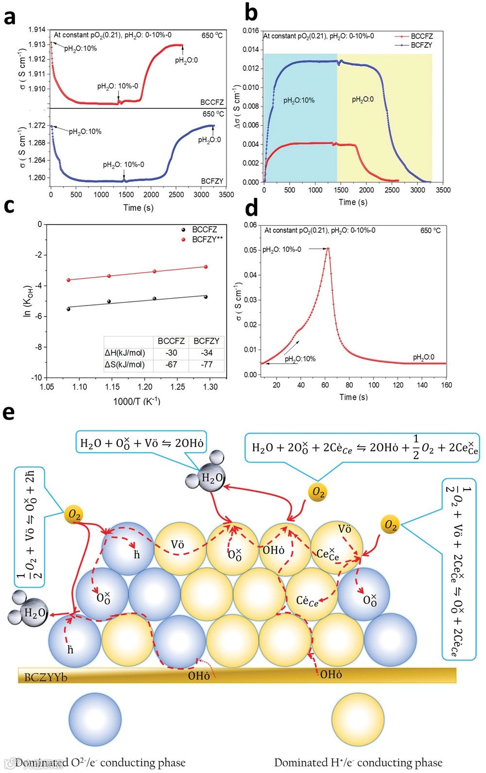 图1 (a)在pH2O(0-0.1-0)和恒定pO2 (0.21)650oC时BCCFZ和BCFZY的ECR曲线;(b)BCCFZ和BCFZY在图(a)所示的电导率变化比较;(c)用于计算BCCFZ和BCFZY的质子缺陷形成焓和熵的Arrhenuis 曲线;(d)在pH2O(0-0.1-0)和恒定pO2 (0.21)650oC时BCZYYb的ECR曲线;(e)对称电池中BCCFZ纳米复合阴极中的质子吸收模式