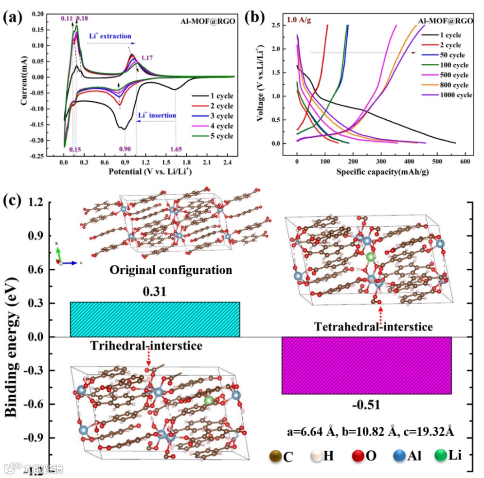 半电池组装的Al-MOF@RGO负极材料在1.0 A/g电流密度下循环1000次后表现出468.5 mAh/g的比容量,展示了其长循环容量增强型的优异储锂性能,同时Al-MOF@RGO//LiFePO4的良好全电池性能测试结果展示了其在锂离子电池中的商业应用潜力和价值。