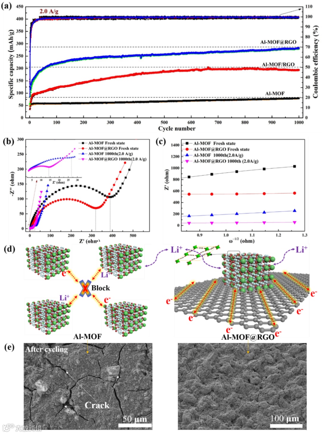 图4.(a)循环性能, (b) 奈奎斯特图, (c) 低频区线性拟合, (d) 嵌/脱锂示意图, (e) Al MOF和Al-MOF@RGO循环后SEM图片。
