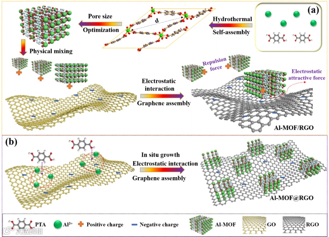 图1.(a) Al-MOF优化及Al MOF/RGO和 (b) Al-MOF@RGO复合材料的制备过程。