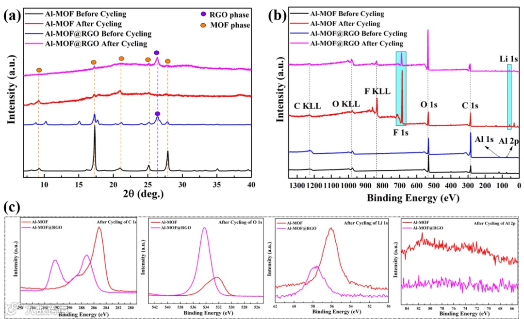 图8. Al-MOF和Al-MOF@RGO 1000次放电/充电循环前后的(a) 非原位XRD图谱, (b) 非原位XPS光谱, (c) C1s、O1s、Li 1s和Al 2p的XPS光谱。