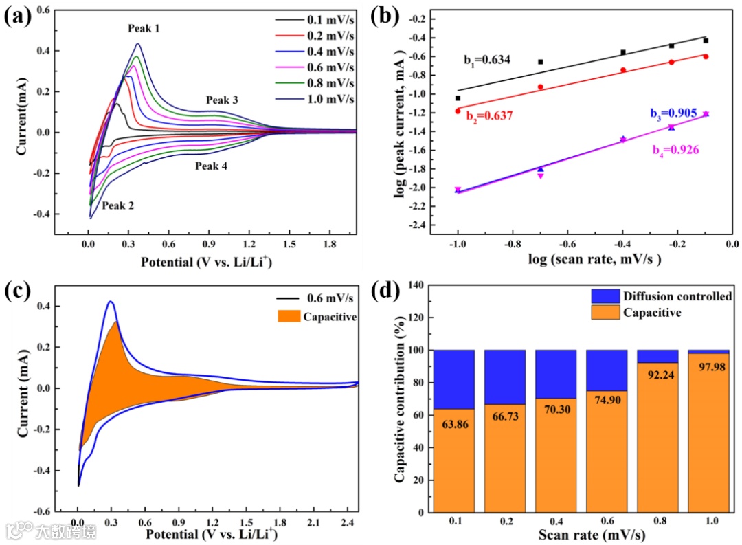 图7. 电化学储锂动力学分析: (a)不同扫描速率(0.1、0.2、0.4、0.6、0.8和1.0 mV/s)下CV曲线, (b) log i和log v拟合线,(c) 扫描速率为0.6 mV/s的电容贡献, (d) 不同扫描速率下电容和扩散贡献的比率。