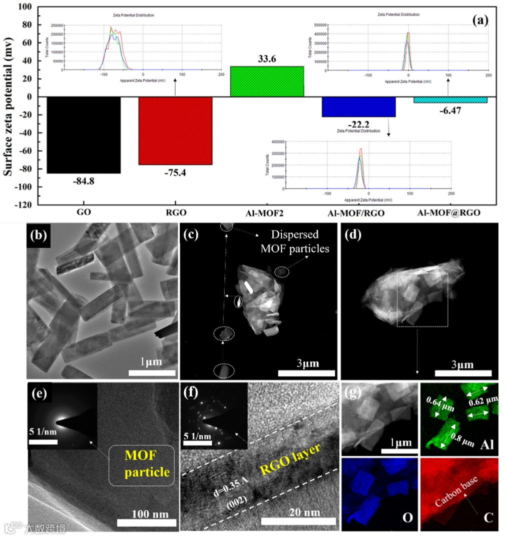 图2. (a) 表面zeta电位分布, (b) Al-MOF, (c) Al-MOF/RGO (d) Al-MOF@RGO的TEM图片,(e) MOF和(f) RGO相的HRTEM和SAED图片, (g) Al-MOF@RGO的EDX图片。