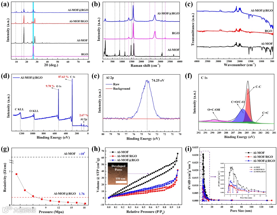 图3. (a) XRD图谱, (b) 拉曼光谱, (c) FTIR图谱, (d) XPS图谱, (e) Al 2p和 (f) C 1s的XPS光谱, (g) 电阻率分布, (h) 吸附-脱吸曲线, (i) 孔径分布图。