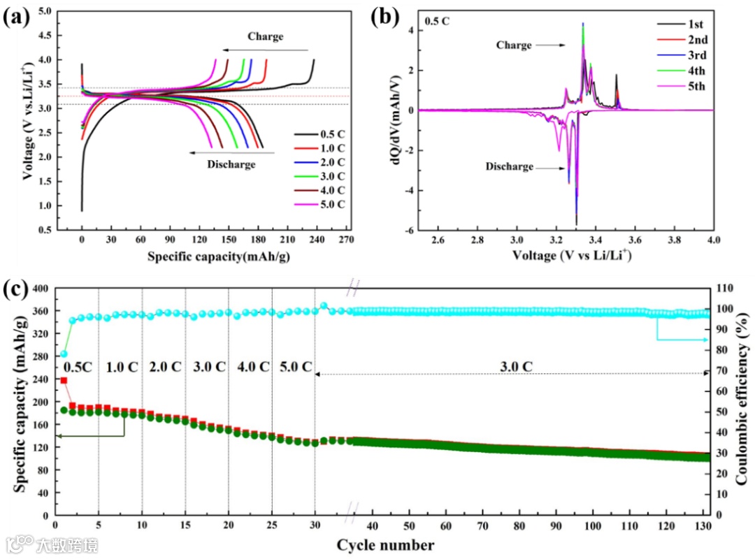 图5. Al-MOF@RGO//LiFePO4全电池系统:(a) 充/放电曲线, (b) dQ/dV曲线, (c) 倍率和循环性能图。
