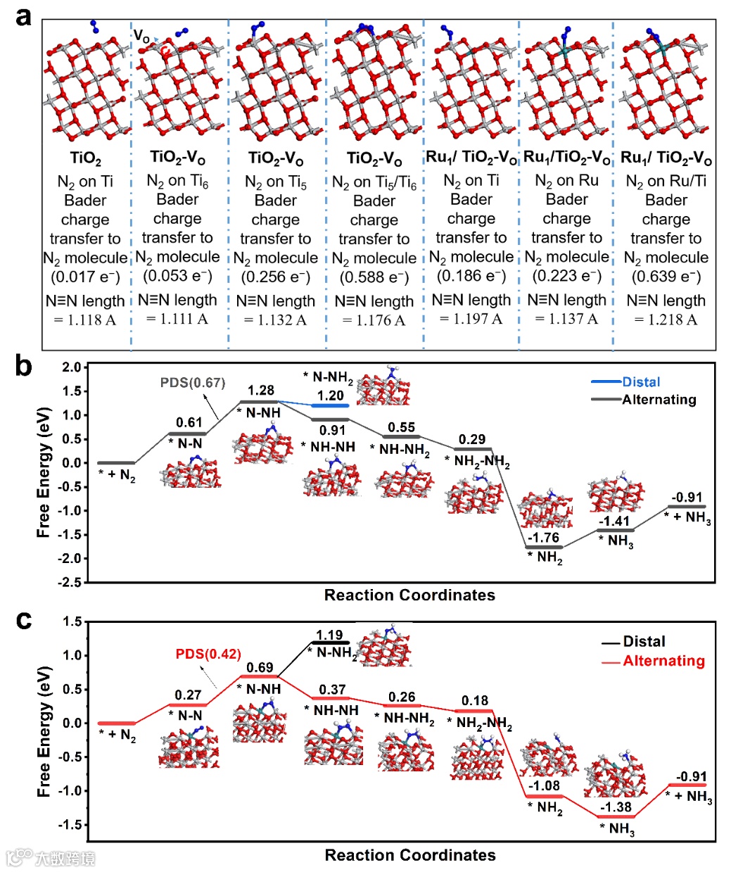 综上所述,钌单原子是一种提高TiO2固氮活性的有效掺杂剂。熔盐过程促进了Ru离子在TiO2表面的原子分布,也促进了氧空位的形成。一系列计算和实验表征技术表明,钌原子掺杂能通过EMSI调节氧空位附近的局域电子结构,进而作为活性位点促进N2的化学吸附和活化,降低N2还原限速步骤的能垒。在不添加牺牲剂和助催化剂的情况下,Ru1/TiO2-Vo具有良好的固氮活性。最后,DFT计算表明,在Ru1/TiO2-Vo优化的Ru-VO-Ti位点上,交替机制比远端机制更有优势。